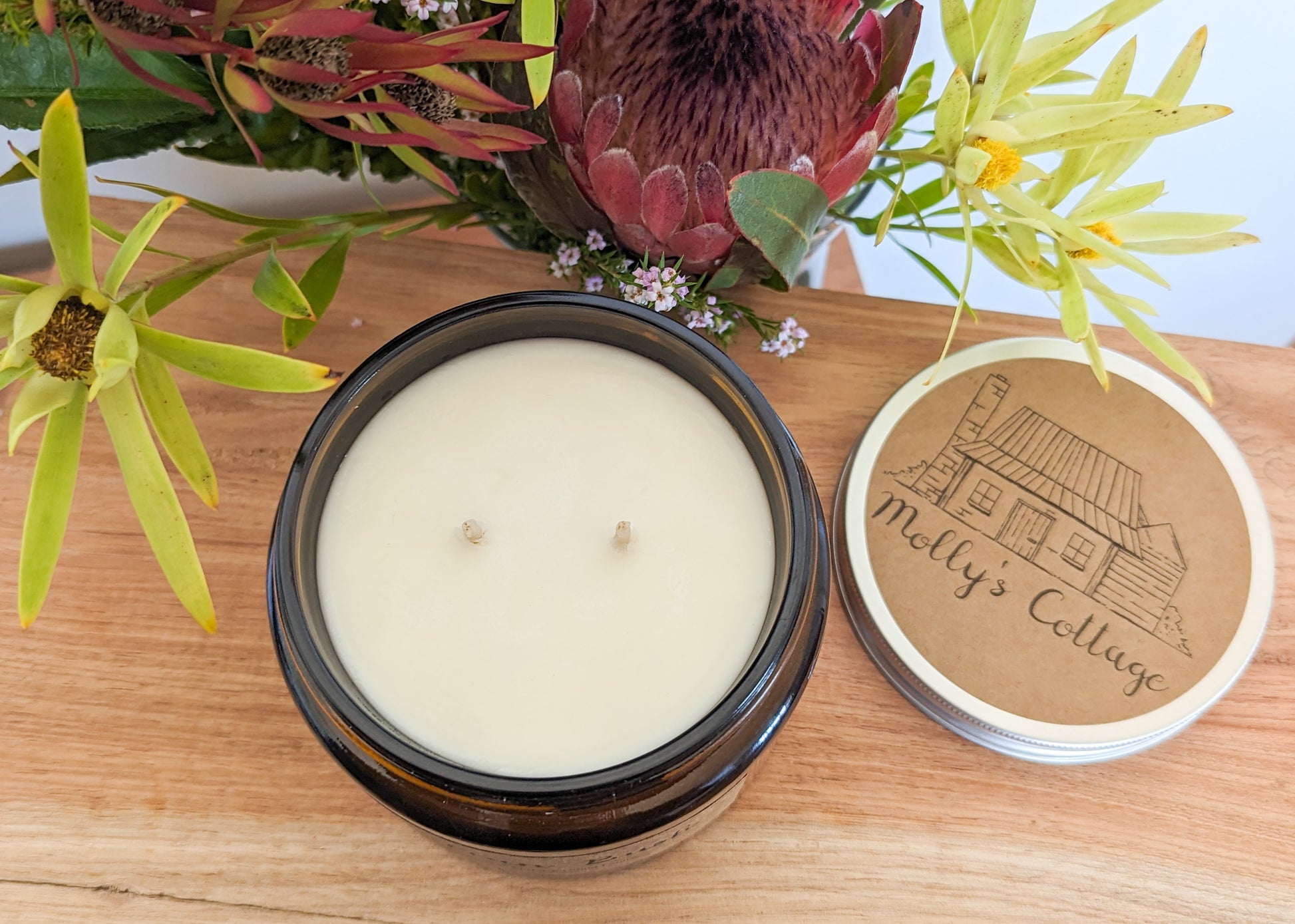 All of our candles are made from 100% natural soy wax and are hand-poured into amber glass jars at our home studio in Hobart, Australia. Our candles have a burn time of approximately 60 hours, for best results trim your wick to 5mm after each burn.