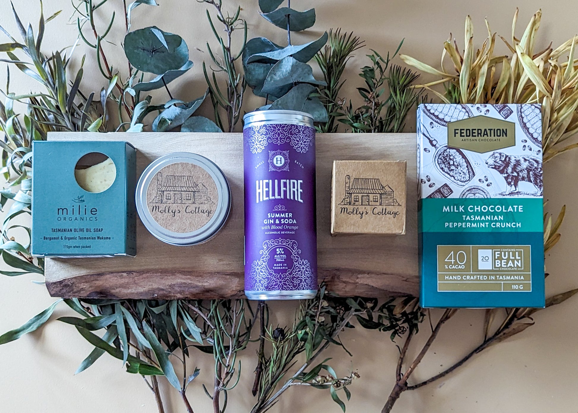 The perfect care package to let someone know that you are thinking of them. A small selection of Molly's Cottage and Tasmanian made products. This gift box has everything they need for a relaxing night in.